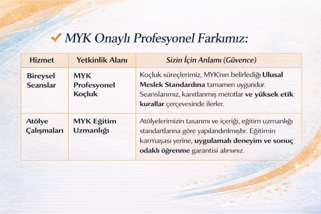 Etik ve Standartlara Bağlılık: Koçluk sürecimiz, MYK’nın belirlediği Ulusal Meslek Standardı çerçevesinde yürütülür. Bu da hizmet kalitesinin ve etik sınırların sürekli korunduğu anlamına gelir.