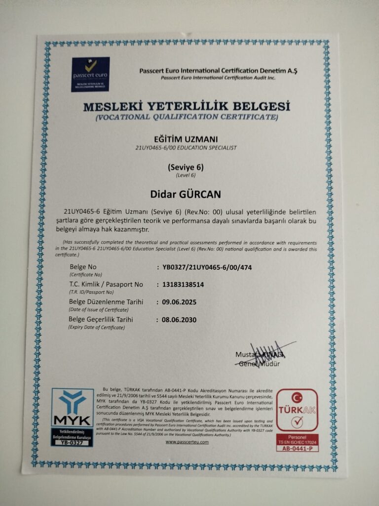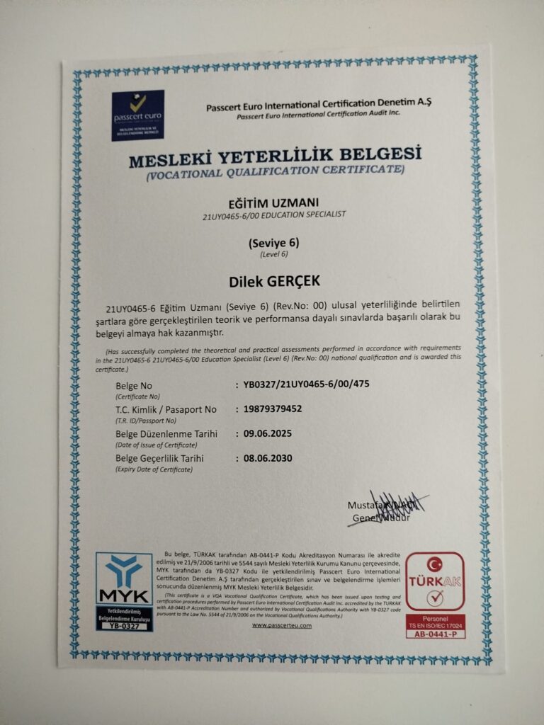 Ulusal Yeterlilik Sistemi’nin güvencesi altında, Mesleki Yeterlilik Kurumu (MYK) tarafından belirlenen standartlara uygun olarak hizmet veriyoruz. Bizler, sektördeki en yüksek yetkinlik ve etik kurallara bağlı kalarak size destek olmaya hazırız.