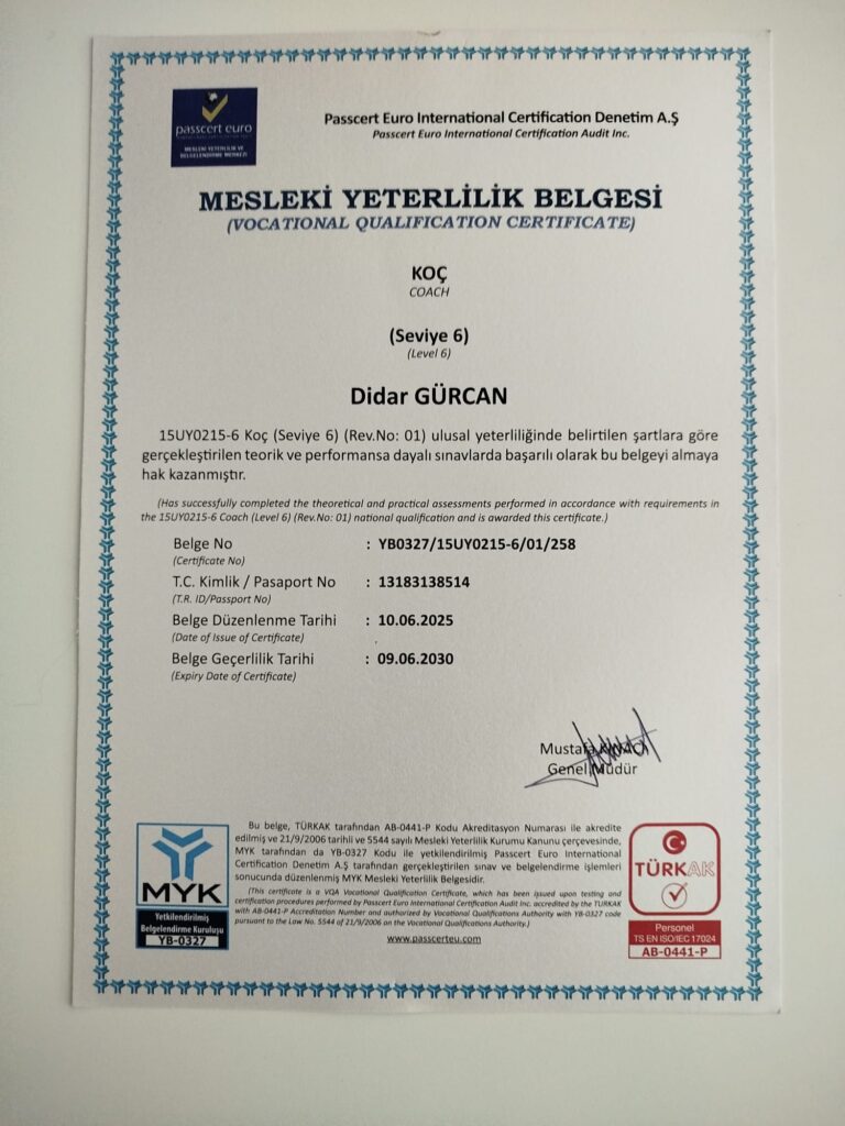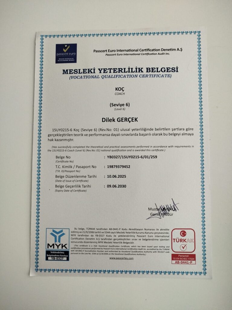 Biz, Koçluk ve Uzmanlık hizmetlerimizi Ulusal Yeterlilik Sistemi’nin güvencesi altında sunuyoruz. Sahip olduğumuz Mesleki Yeterlilik Kurumu (MYK) onaylı Koçluk ve Eğitim Uzmanlığı belgeleri, profesyonel kalitemizin tescilidir.